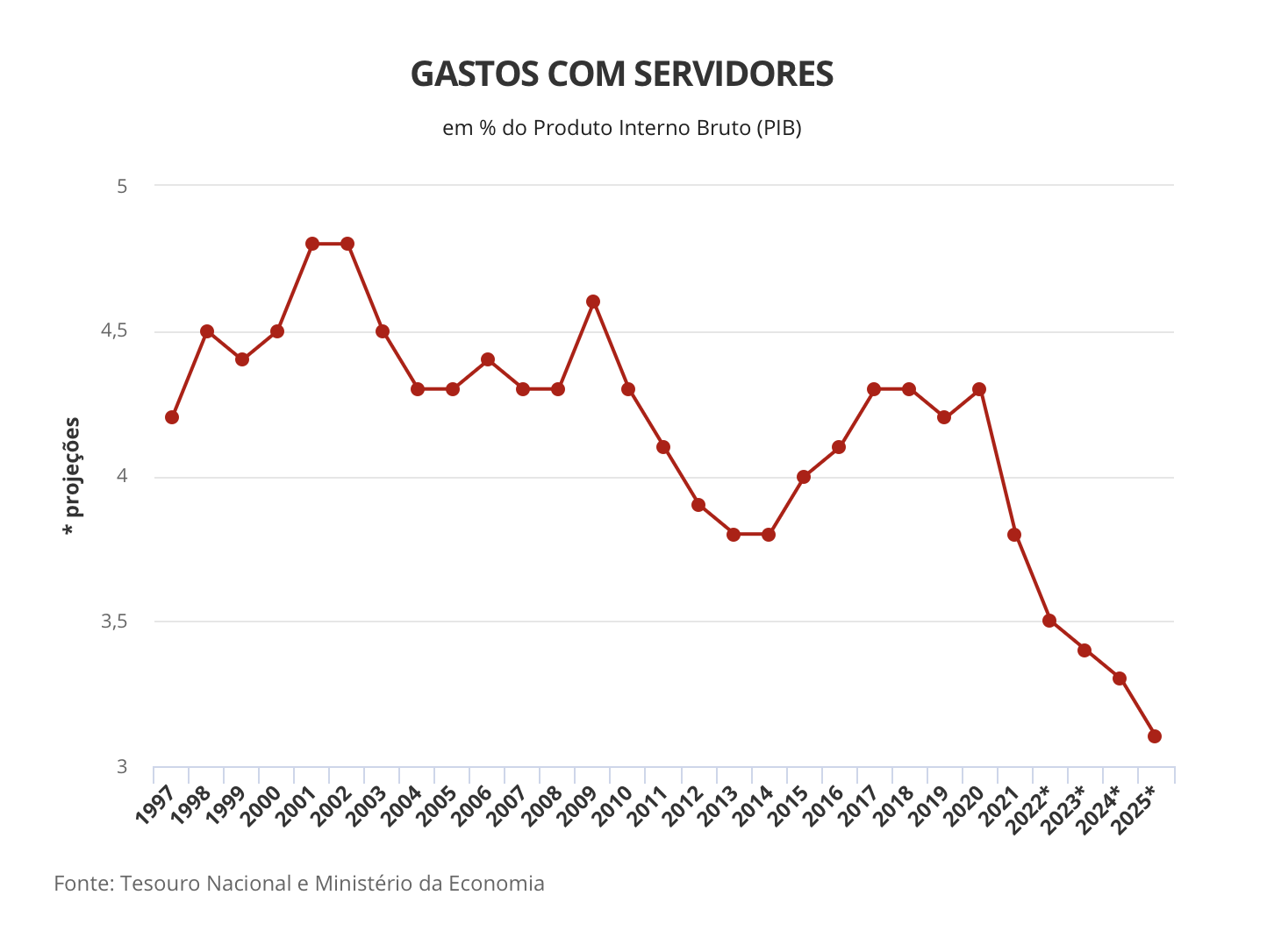 Após menor marca da história em 2021, governo prevê reduzir ainda mais gasto com pessoal.